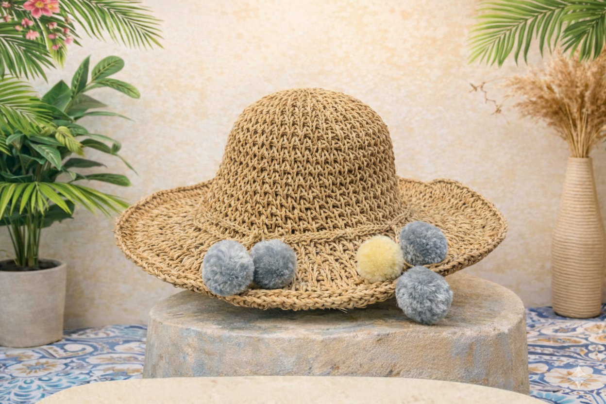 A classic woven straw hat enhanced with soft pom-pom details, offering an elegant and natural appearance. Designed for comfort and style, this hat is perfect for outdoor activities, beach holidays, and resort fashion. Each piece is carefully handcrafted using traditional weaving techniques.