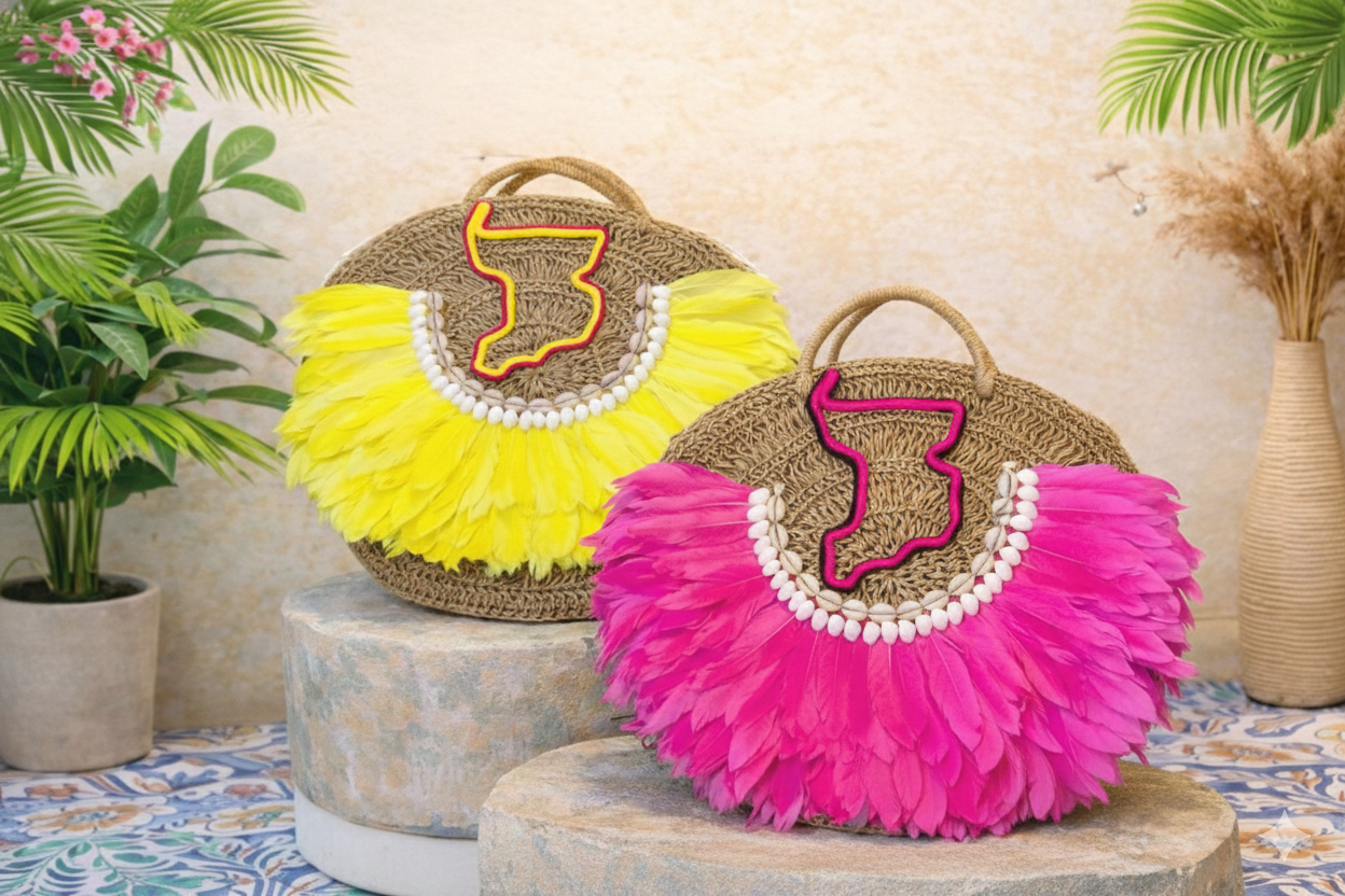A distinctive Lombok straw bag adorned with vibrant feathers and natural shell accents, reflecting rich local craftsmanship and cultural identity. Its artistic and bold design makes it a statement piece for modern ethnic fashion. Ideal for export markets seeking unique, handcrafted products with strong cultural value.